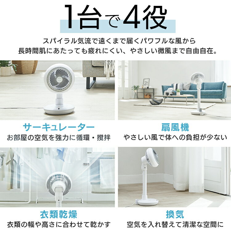 ●商品サイズ(cm)幅約24.7×奥行約27.7×高さ約36.9〜61.2(停止時、電源コード含まず)●本体質量約2.6kg●電源AC100V、50/60Hz●消費電力25W●適用床面積24畳●風力切替連続モード:10段階リズムモード:3段階●送風モード連続・リズム・強制撹拌●首振り上下左右(60°・90°・120°)●タイマー入/切●電源コード長さ約1.7m(検索用:コンパクト サーキュレーター 扇風機 送風 部屋干し 室内干し 空気循環 タイマー 4967576528245)